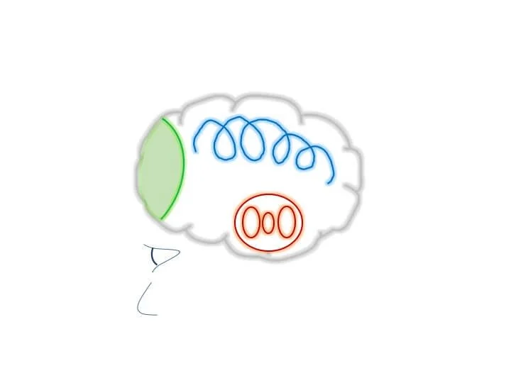 The green part a the front of our brain is what I call the "Conscious Mind". This is the part that is most active when we are awake, when we are focused on tasks or making decisions. This part is like a boss - good at taking charge and regulating activities - but like any boss, it can't do everything and it can occasionally get tired and overwhelmed.